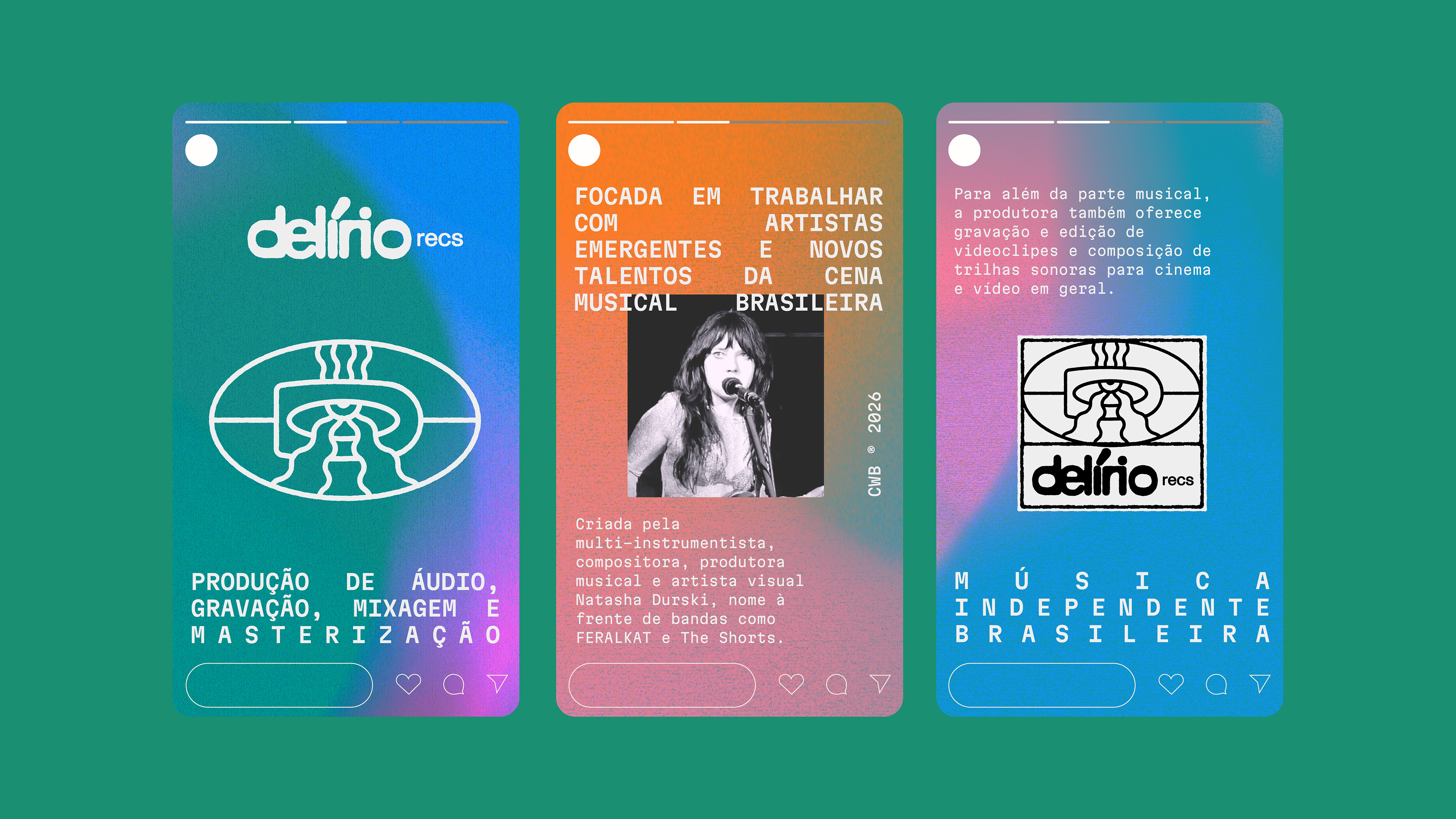 PT | Fomos convidados a desenvolver a identidade visual da Delírio Recs, selo e produtora musical independente sediada em Curitiba. Um projeto que nos permitiu articular duas frentes que atravessam o cotidiano do estúdio: o design gráfico e a música.