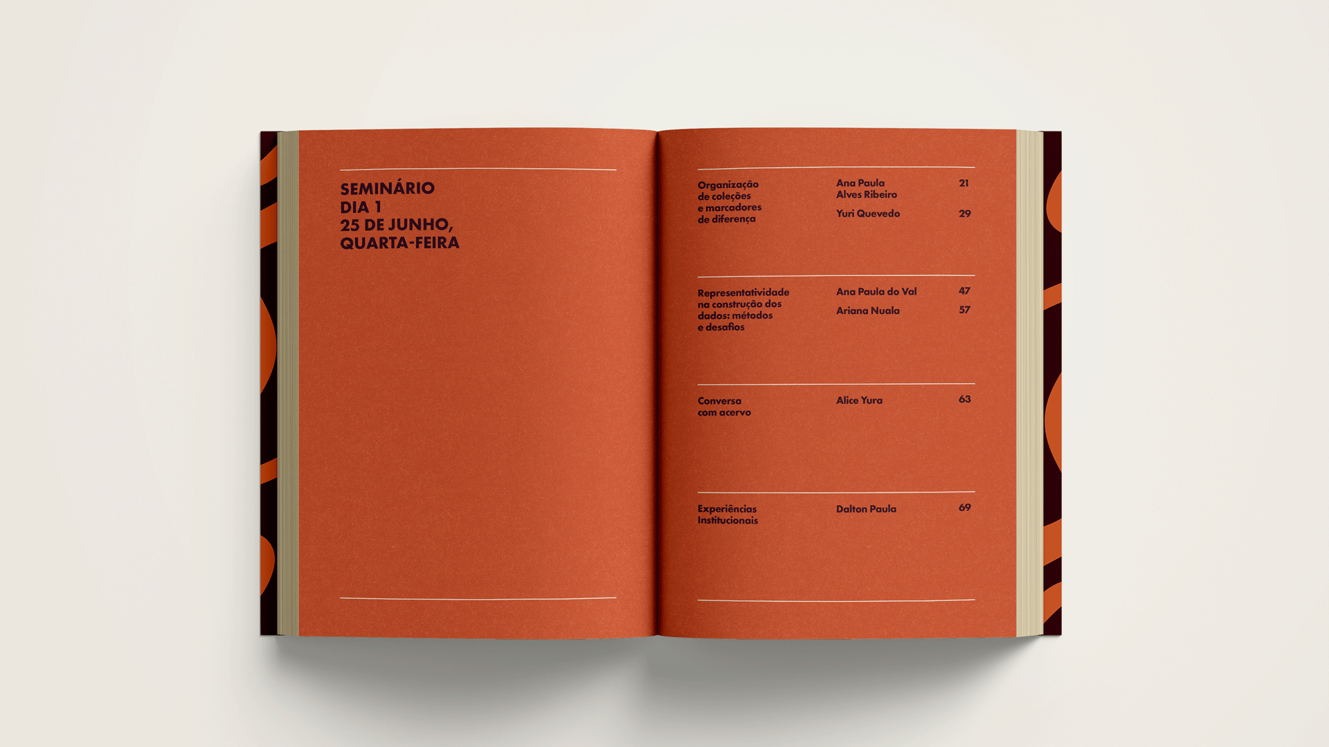 The graphic concept was grounded in the idea of preserving the memory of the event. To achieve this, we developed a grid inspired by the seminar’s calendar, organizing the content according to each day of the program. The horizontal lines defined by this grid run throughout the publication, structuring and delineating articles and information.